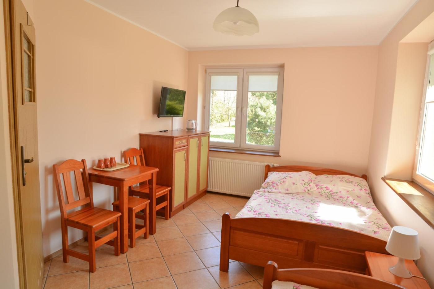 Pokój Trzyosobowy z prywatną łazienką. The triple room offers a wardrobe, an electric kettle, as well as a private bathroom featuring a walk-in shower. This triple room features a barbecue, a tiled floor, a flat-screen TV and garden views. The unit offers 2 beds. Pokój Trzyosobowy - 3 osobowy. Powierzchnia pokoju ok.: 16 mkw. ;